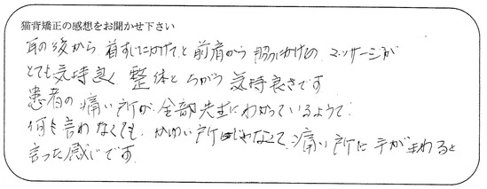 患者の痛い所が全部先生に分かっているようで何も言わなくても、かゆい所じゃなくて痛い所に手がまわると言った感じです。