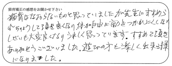 猫背は治らないものと思っていましたが先生に勧められ治療して頂き良くなり、体が自由に動き疲れにくくなり姿勢も大変良くなりうれしく思っています。勧めて頂きありがとうございました。遊びの方も楽しくできるようになりました。